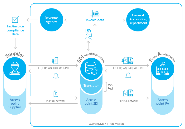 - Aggiornamento del Sistema nazionale di Interscambio delle fatture elettroniche (SDI) gestito dall'Agenzia delle Entrate al fine di garantire che le pubbliche amministrazioni italiane possano ricevere fatture conformi allo standard europeo;